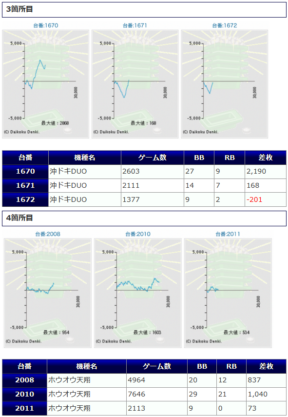 箇所での盛り上がりは、殆どがプラス差枚を達成し、+4,000枚オーバーが複数見られている、④箇所目「鳳凰天翔」が際立っていた印象ですね。ノーマルタイプらしい抜群の安定感を見せつけてくれました。
