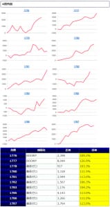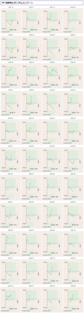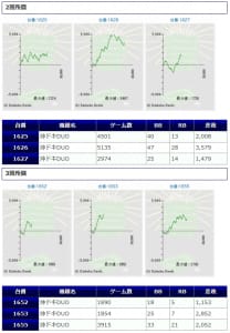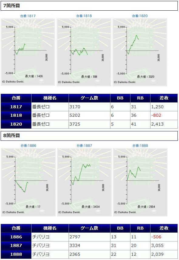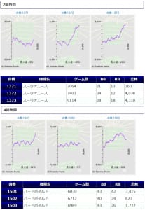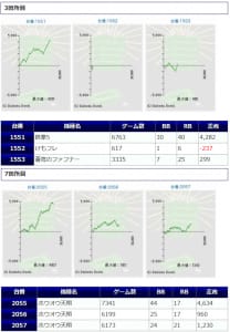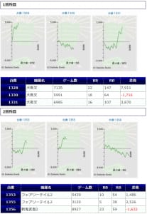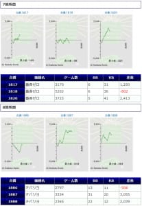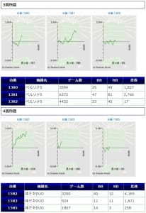 その他箇所を含めた全体のスランプグラフを見ると「キレイな右肩上がり」が多数見られ、差枚を多く獲得できた台はしっかりと伸ばし切って説得力のあるデータとなっており、高配分だった事が窺えるかと思います。残念ながら全台プラスとはいかず、展開が悪かった為に差枚マイナスとなった台は幾つか見受けられますが、結果数値から見ても仕掛けの信頼度は高いと言えるでしょう。