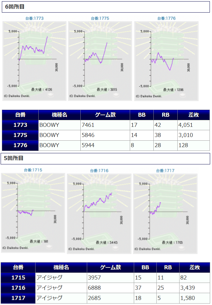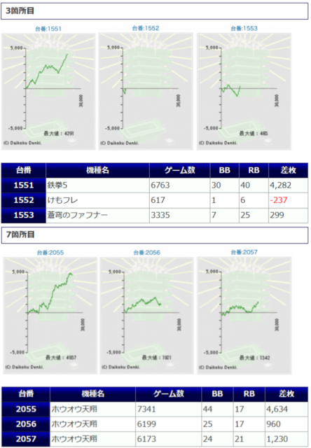 9台中、6台がプラス着地に成功し、プラスとなった台は全てが4桁差枚となっており、+3,579枚、+2,852枚、+2,052枚等の出玉が獲得されました。