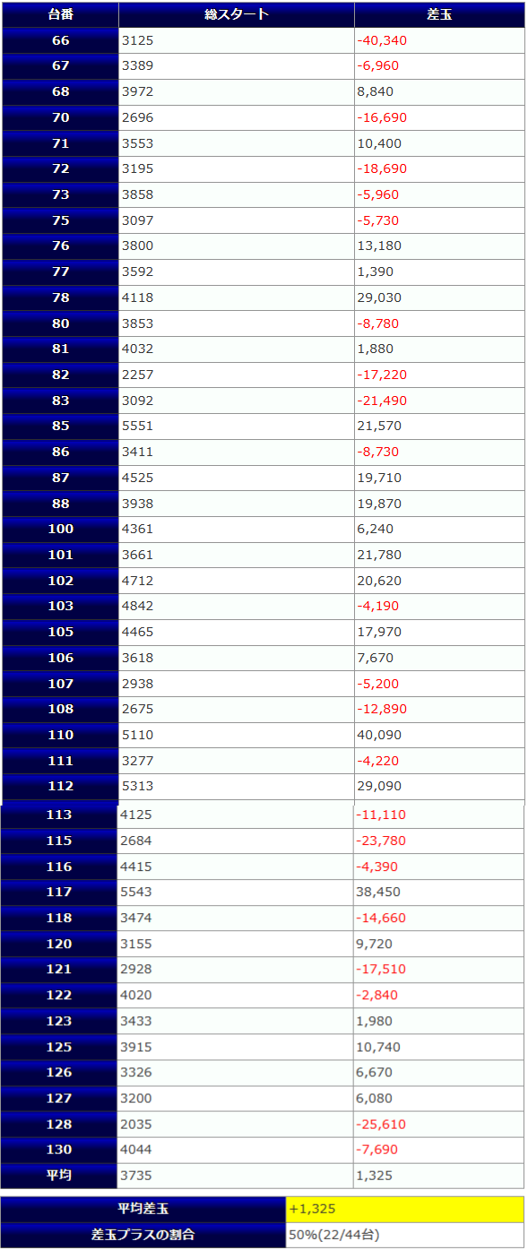 +29,560発、+23,230発、+21,850発等の大きな差玉獲得が複数見られ、全44台中、半数以上の26台がプラス着地に成功。総差玉数は+98,130発、1台平均+2,230発でユーザー側の勝利となりました。
