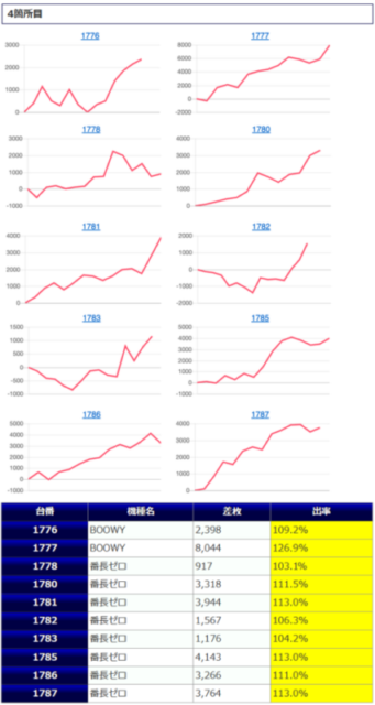 稼働1,000回転未満の台が幾つか見られるにも拘わらず、これだけの結果が出ていますから、まだまだポテンシャルを秘めている言ってもよいでしょう。