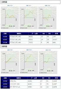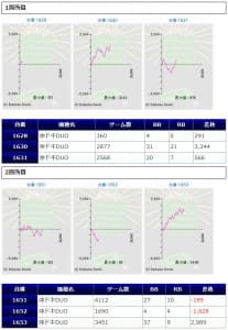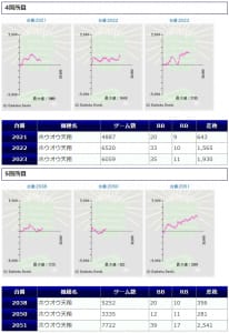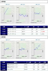 こちらの2台は右肩上がりの出玉推移を描く安定した挙動となっていた事がスランプグラフから読み取れ、ユーザーは手応え十分に終日楽しめていた事が窺えるものとなっています。