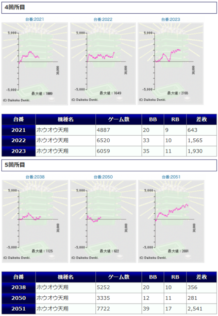 「鳳凰天翔」は、2箇所、6台の仕掛けになっていましたが、半数の3台がプラス着地に成功し、プラスとなった台は4桁差枚での着地となっています。
