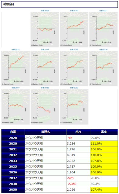 ①箇所目「沖ドキDUO」+4,023枚、②箇所目「沖ドキDUO」+6,266枚、③箇所目「鳳凰天翔」+2,834枚、④箇所目「鳳凰天翔」+4,849枚、+3,284枚と、各箇所から目立った差枚獲得がされています。