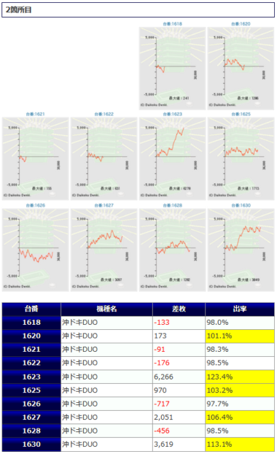 ③箇所目「沖ドキDUO」は3台並んでプラス差枚、勝率100%を達成しています。推測するのが困難な機種ではありますが、同機種にしては稼働良好で、4,000G以上追われている台もありますので、手応えは感じられていたように窺えます。