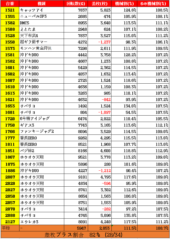 ⑥と気づかれる事なく、稼働も少ないままに閉店を迎えている台も見受けられますが、投入量、平均差枚、出率、勝率、何れも好結果に纏まり、等価営業ながら、構成台の公称設定⑥出率の平均である108.7%を大幅に上回る出率(111.5%)に仕上がっています。よって、中身に一定の信頼は保てるものになっている印象です。