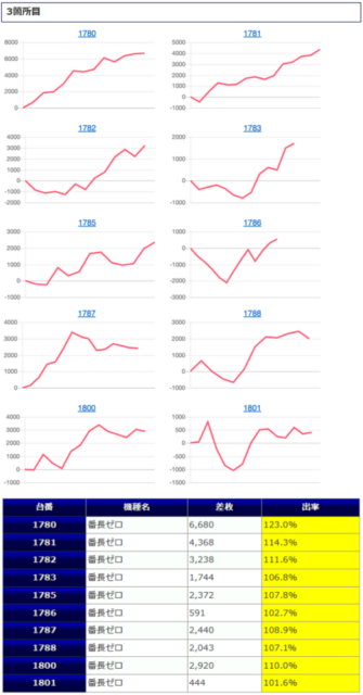 「キャッツアイ」+5,823枚を筆頭に「チバリヨ」+5,096枚「鳳凰天翔」+4,793枚、+3,778枚「絆2」+4,600枚「番長ZERO」+4,295枚「エウレカ3」+4,240枚「ファンキー2」+3,529枚等、「最高」らしい大きな差枚が複数見られ、差枚を多く獲得できた台はしっかりと伸ばし切って説得力のあるデータとなっています。