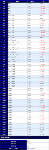 その他からは「ガンダムUC」+45,740発「慶次3」+30,370発「エヴァ未来」+34,930発「沖海5」+38,920発「沖海5アイマリン」+22,980発、+22,670発等、多くの優秀な差玉が確認され、+1万発+2万発は当たり前の「お祭り騒ぎ」となりました。