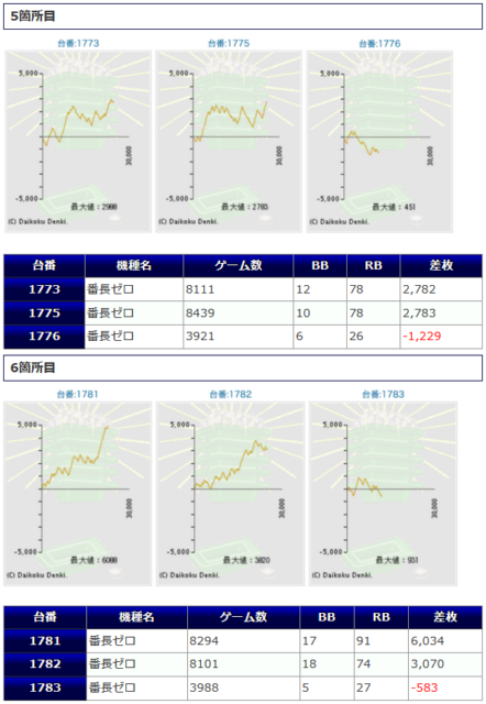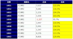 中身を見ていくと、①のアラジンAクラシック箇所は+5,039枚、+4,797枚といった大きな差枚も飛び出しつつ、10台中9台がプラス差枚という、荒波のアラジンらしからぬ安定した結果となっています。