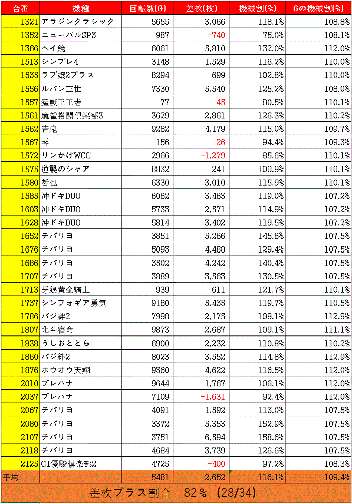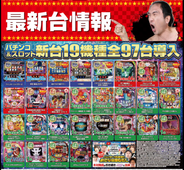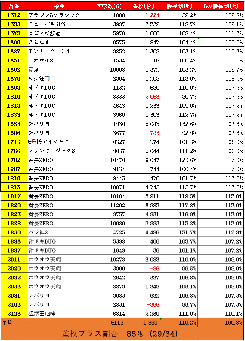 今回も半数以上が沖スロ系AT機中心なのはいつもの配分に加えてアラジンクラシックが5箇所とめずらしい配分となりました。