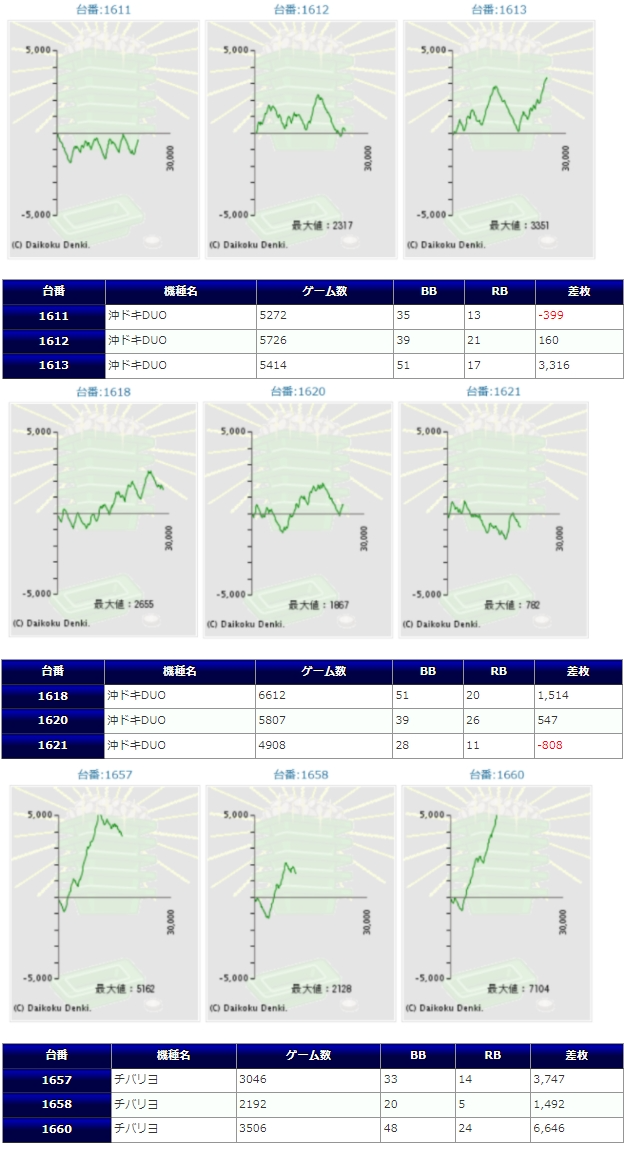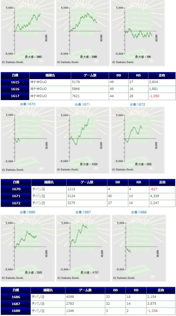 構成は4箇所の「沖ドキDUO」に5箇所の「チバリヨ」と、今回は半数以上ですが沖スロ系AT機中心なのはいつもの配分。