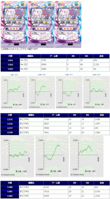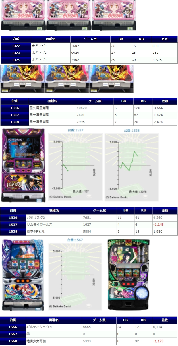その他では最新台の「アラジンAクラシック」「まどマギ2」「バジ絆2&北斗宿命」「プレハナ」で各1箇所用意され、プレハナ、絆2は不発気味ですが、北斗宿命、まどマギ2、アラジンクラシックと最新台、人気台で安定感ある結果。