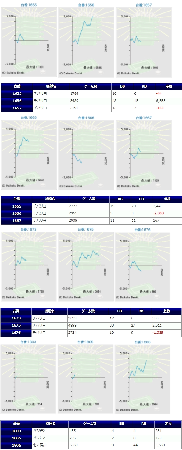 構成は6箇所の「チバリヨ」に2箇所の「沖ドキ」と、今回は半数以上ですが沖スロ系AT機中心なのはいつもの配分。