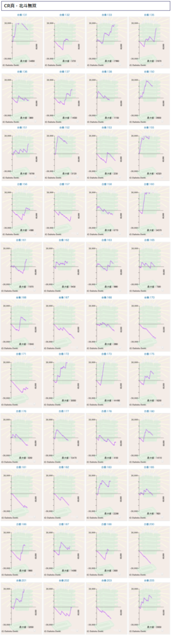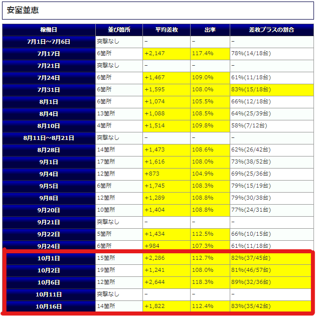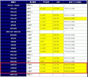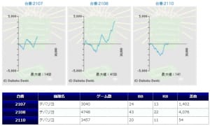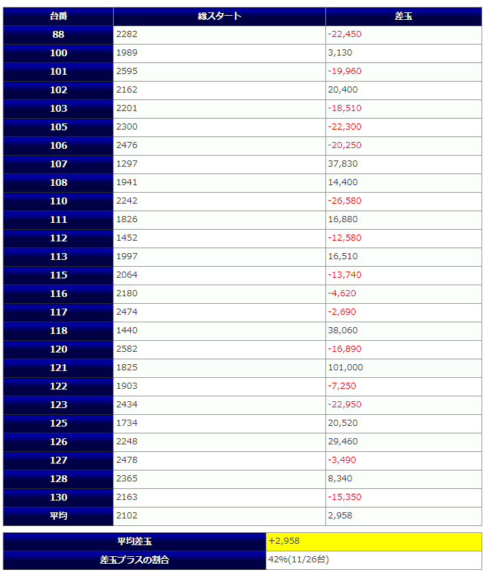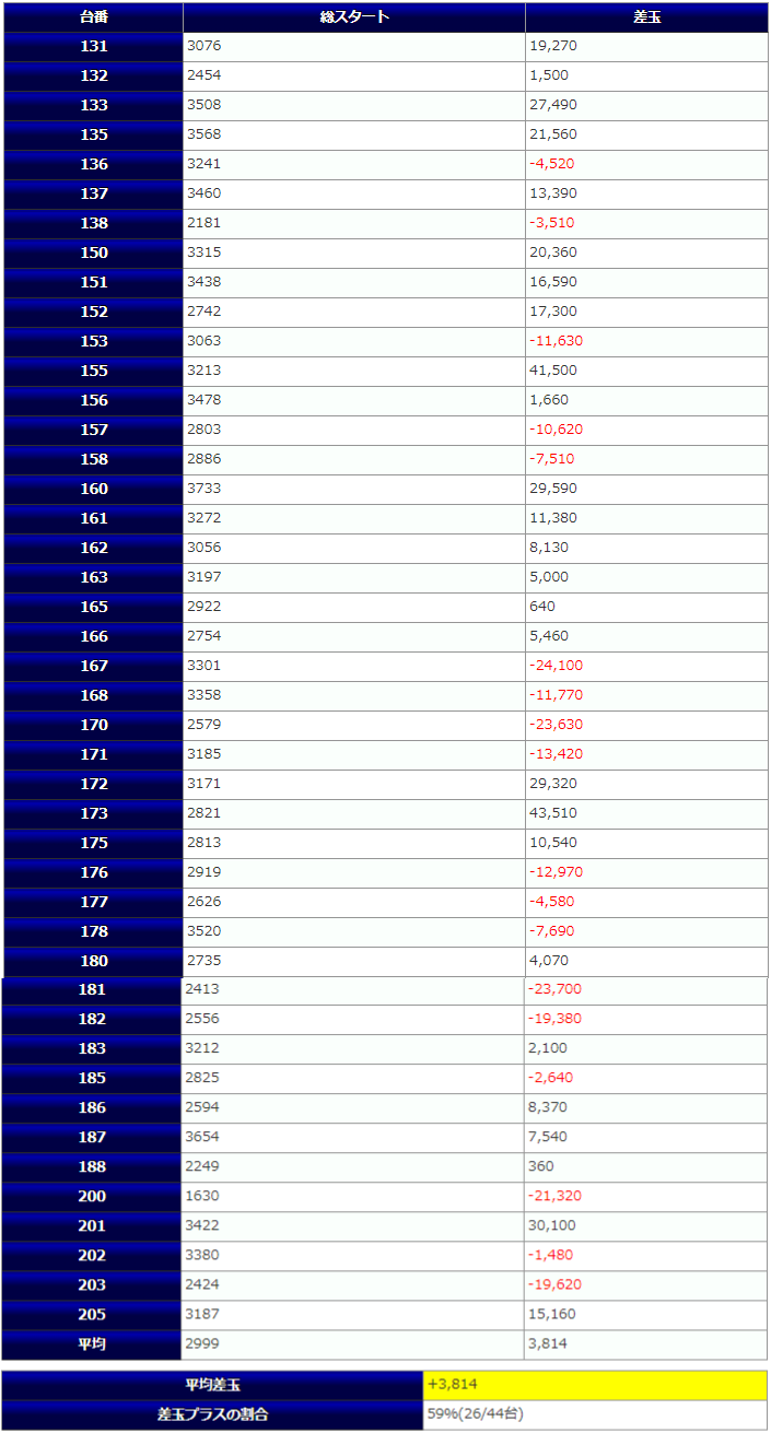 対照的に「チバリヨ」が不発になっており、信頼できる同店での仕掛けですから、今回のデータは機種のポテンシャルにやや疑問が残る結果になったのではないでしょうか。チバリヨでこれだけ不発になっているにもかかわらず、対象位置の平均出率が108%あるというのも素晴らしいですね。