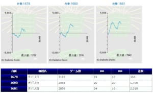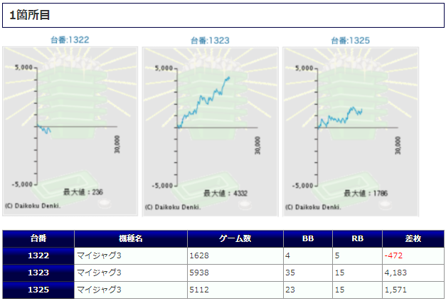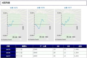 一部ピックアップさせていただくと、番長3の3箇所9台の並びでは、1823番台からは+6,880枚を筆頭に、1771番台から+5,081枚、他にも+4,000枚クラスが2箇所としっかり出玉のついて位置が多数あったと思います。