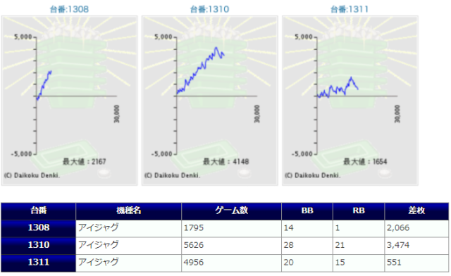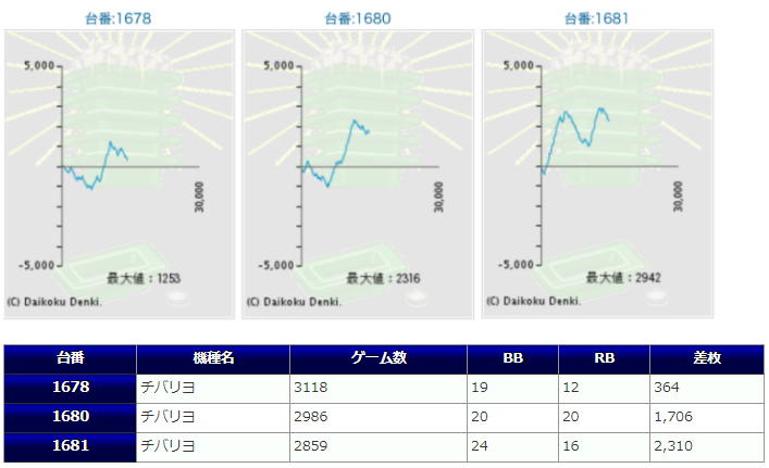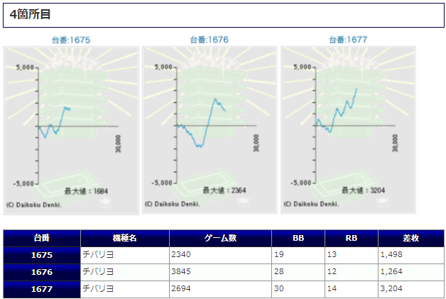 それ以外でも、マイジャグⅢ・Ⅳでは、+3,443枚&+2,453枚、グレキンからは+1,858枚&+1,432枚、、紅桜の+5,100枚、チバリヨが6箇所18台のボリュームで、1680番台からの+6,574枚を筆頭に大きく差枚がついていたと思います。