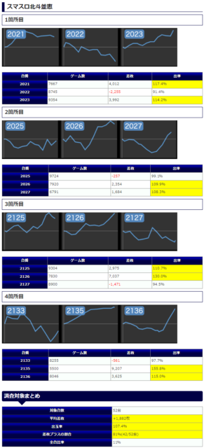 今回は『10台並び系』が3種と『北斗×並び系』の計4つの公約が織り交ざる環境での開催となっていたようです。最終的には平均差枚+1,882枚&出率107.4%&勝率81%と高水準な内容での決着となりました。