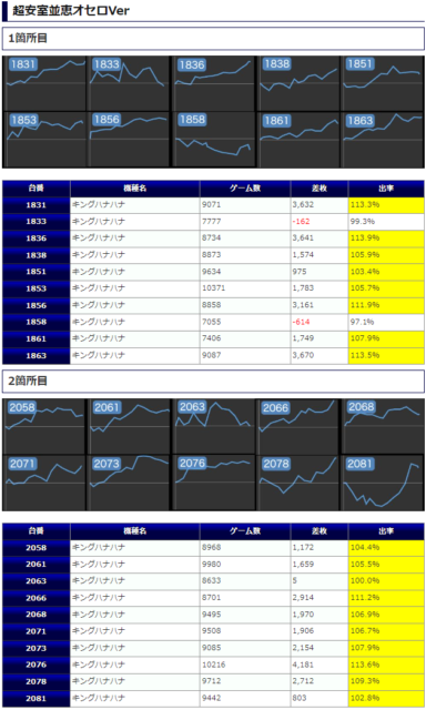特に同店お馴染みの「キングハナハナ」が魅力的な結果を残しており、差枚+4,181枚&+3,670枚&+3,632枚&+3,641枚&+3,161枚といった目の惹く出玉が散見できる環境となっていたようです。特に『1台置き』の2箇所に関しては全台差枚プラスを決めていますので特に目立つ存在だったのではないでしょうか。