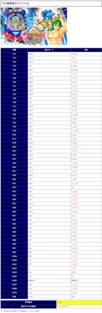 「大海5」平均2,493回転、「大海4SP」平均1,236回転と全体的に感触を掴んでいたであろう打ち込みが多々見られるも「大海4SP」はプラス差玉での決着となりましたが、トータル結果では惜しくもユーザーマイナスに着地。