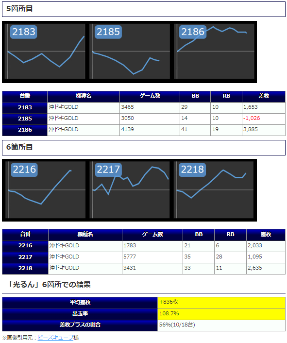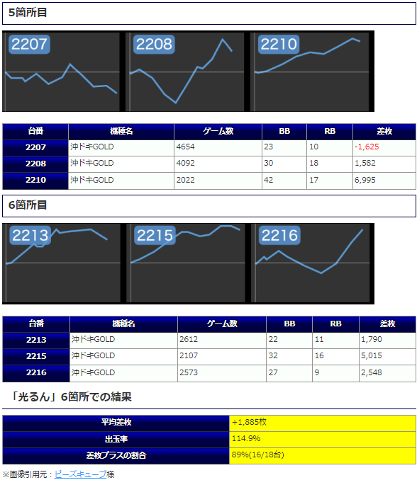 そして「沖ドキGOLD」では5箇所目:差枚+1,653枚&+3,885枚、6箇所目からは差枚+2,033枚&+1,095枚&+2,635枚と全台で目の惹く出玉を披露!打込量も全体的に程よい内容となっている事からも手応えを感じられる環境であった事は間違いないでしょう。