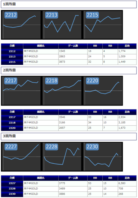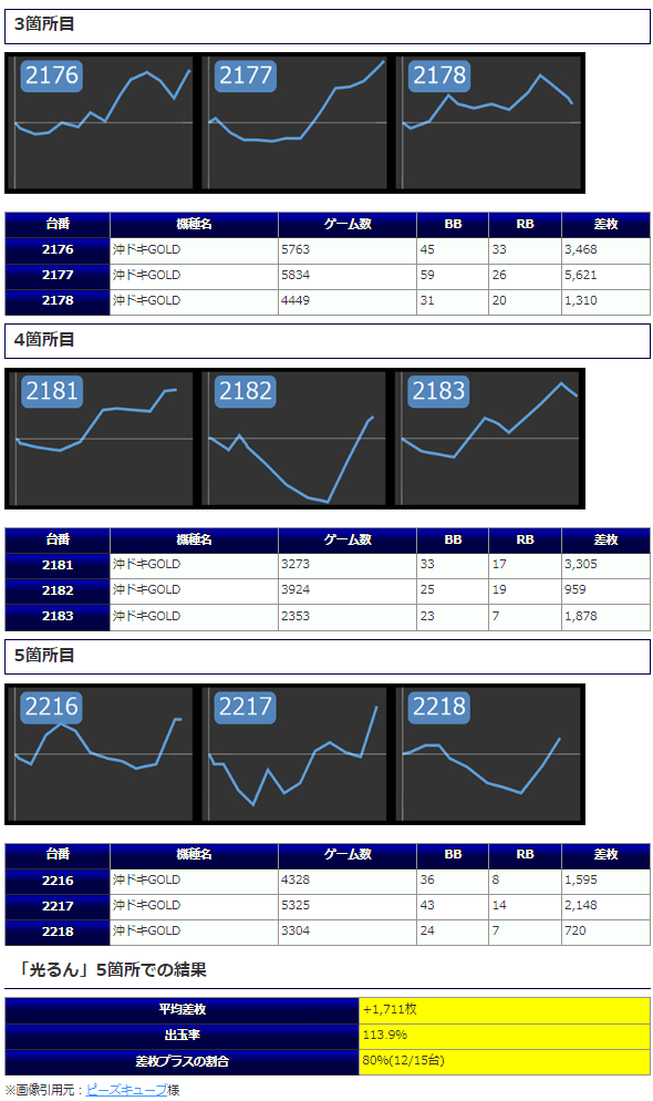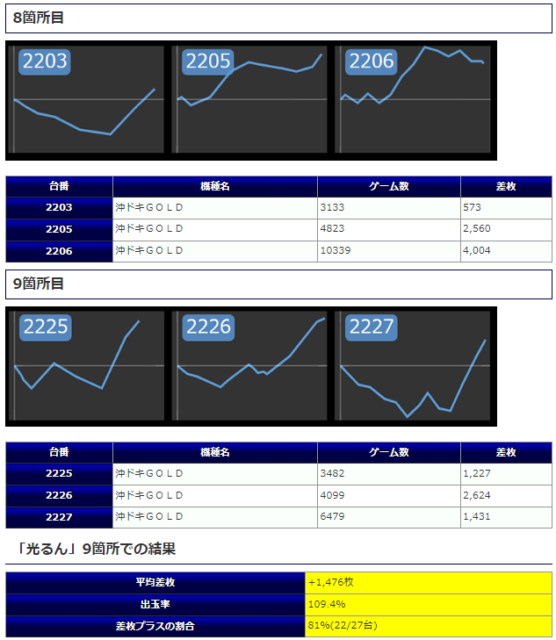 凡そ、前途の台に関しては対象台と判断するには十分な内容とも判断できそうであり、その好調台を基軸にどうにか打つ根拠を見出してほしかったところでしょうか。唯一箇所全体で盛り上がりを魅せているのは9箇所目の「沖ドキGOLD」となっており、差枚+1,227枚&+2,624枚&+1,431枚と見応えのある出玉が多数確認できています。