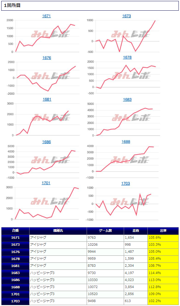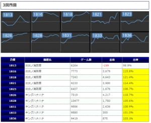 『1台置き』2箇所目では万回転を筆頭に全体的に確信の打込を魅せており、対象10台何れもプラス差枚を記録するといった優秀な結果を魅せけてくれました。出玉の上下はあれど、差枚+3,583枚&+2,817枚&+3,970枚&+2,117枚&+3,771枚とこれだけの反応を示していますので潜んでいたレベルは高品質なものであった可能性が極めて高そうです。