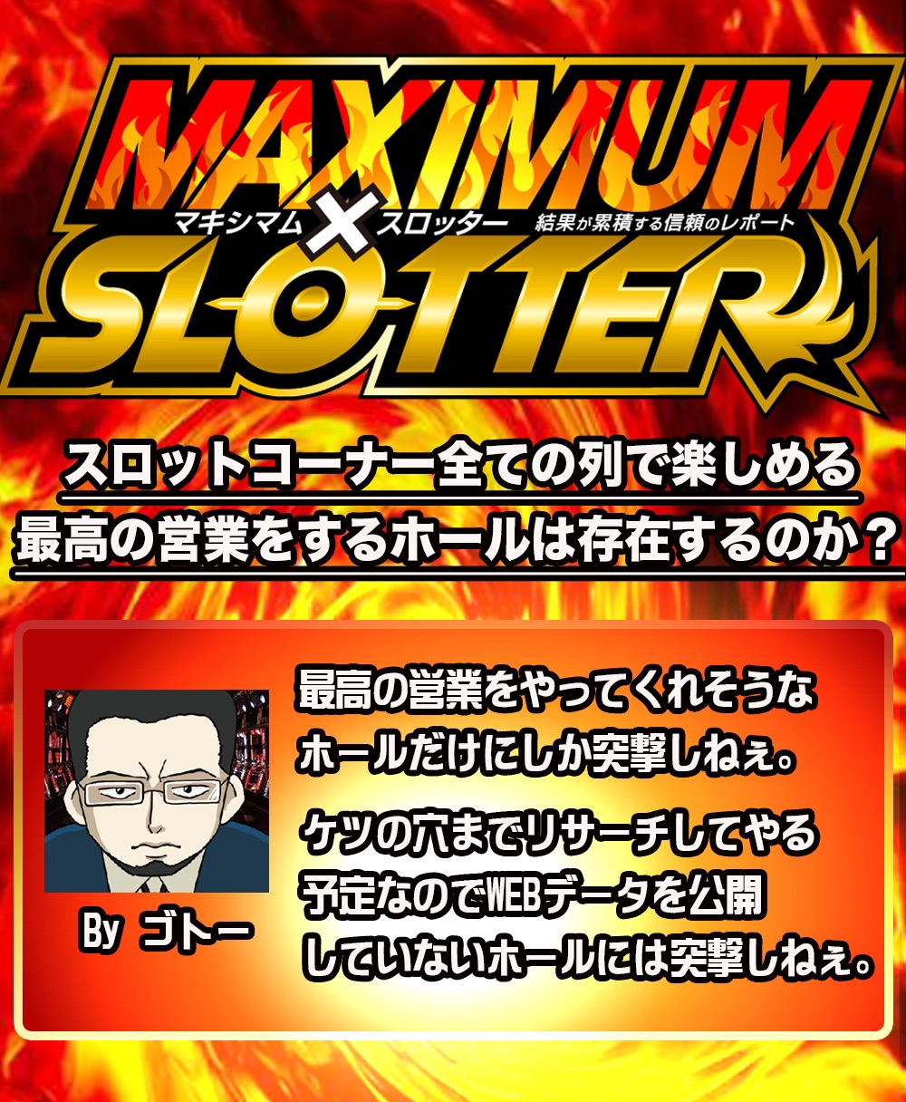 「最高の営業をやってくれそう」と、取材運営側が厳選したホールのみでの開催となる【マキシマム×スロッタ―】ですので、その信頼度、期待度の高さが推し量れます。