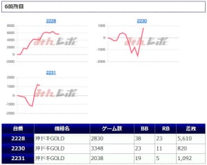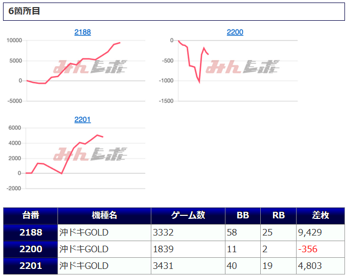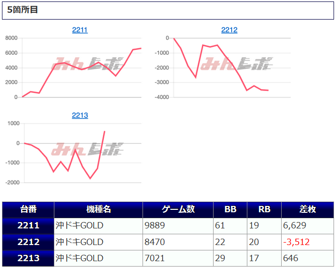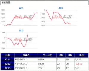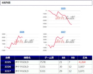 大きな出玉が確認されたのはAT機「沖ドキGOLD」からで、+6,629枚、+3,071枚、+3,007枚が炸裂。