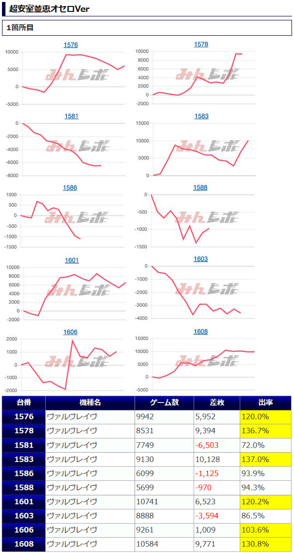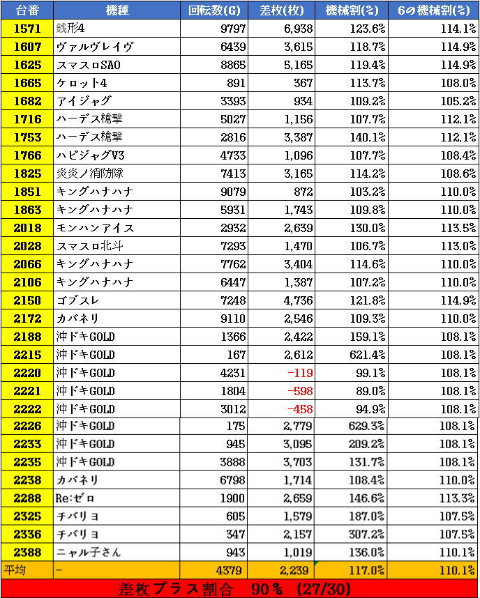 結果を見ていくと、「銭形4」+6,938枚の大きな出玉を筆頭に「スマスロSAO」+5,165枚「ゴブスレ」+4,736枚「沖ドキGOLD」+3,703枚「ヴァルヴレイヴ」+3,615枚等々「最高」らしい好結果が散見され、多くの台がしっかりと伸ばし切って説得力のあるデータとなっています。