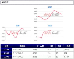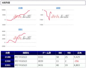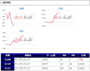 平均稼働2,188回転と良好な稼働で複数の台から結果が伴っていますので、状況の良さが推し量れます。