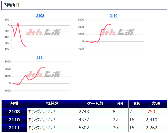 ノーマルタイプでは、「キングハナハナ」の+2,510枚を筆頭に、プラス差枚が複数と堅実な結果が披露されました。