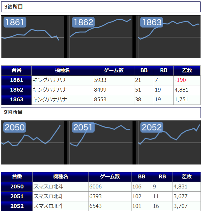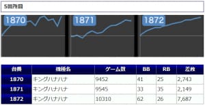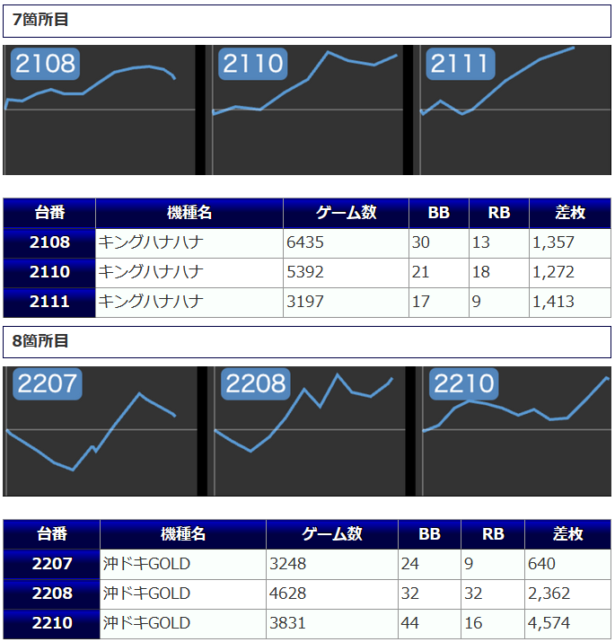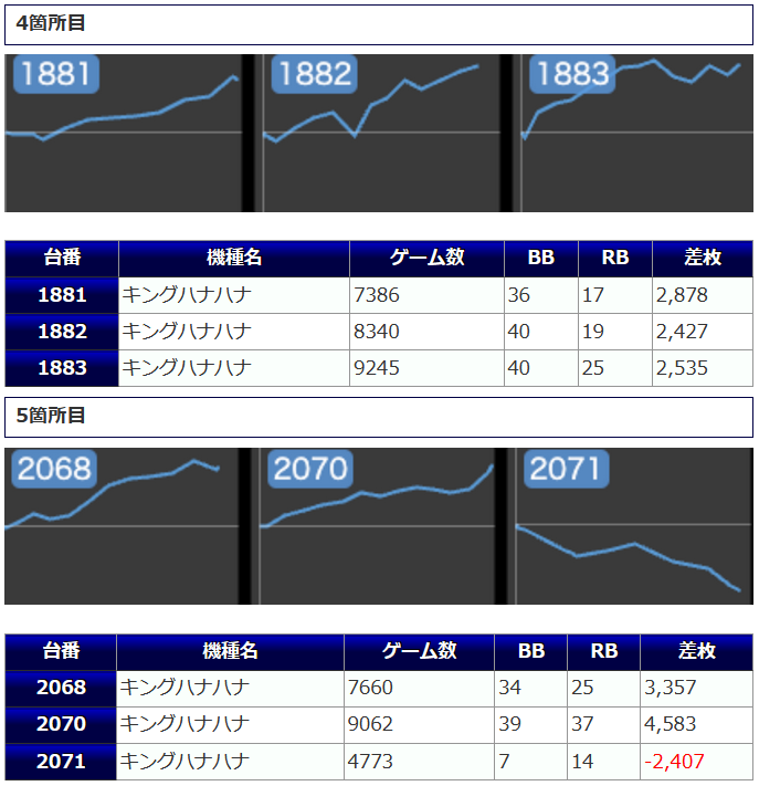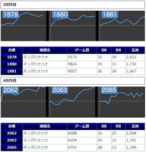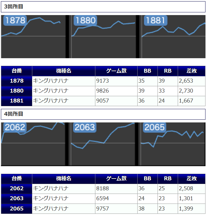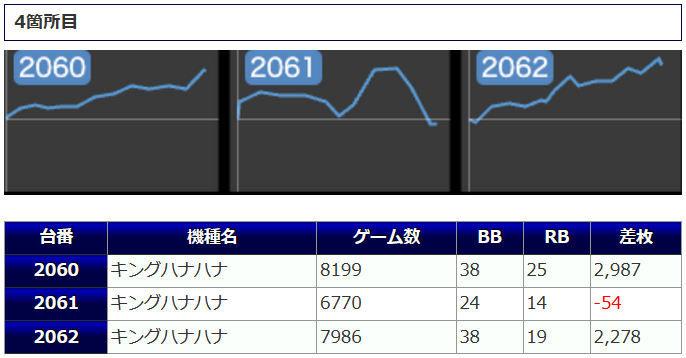 まず、4箇所12台と手厚い扱いになっていた「キングハナハナ」ですが、+2,062枚を筆頭に4桁差枚が多数から炸裂。