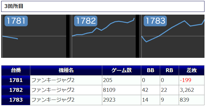人気のジャグラーシリーズでは「ファンキー2」が仕掛けにラインナップされており、+1,887枚、+1,376枚と纏まった出玉が獲得されつつ、3台並んでプラスと手堅い仕上がりになりました。