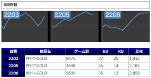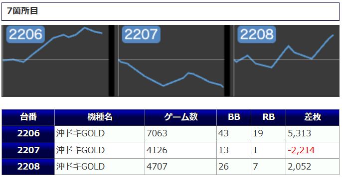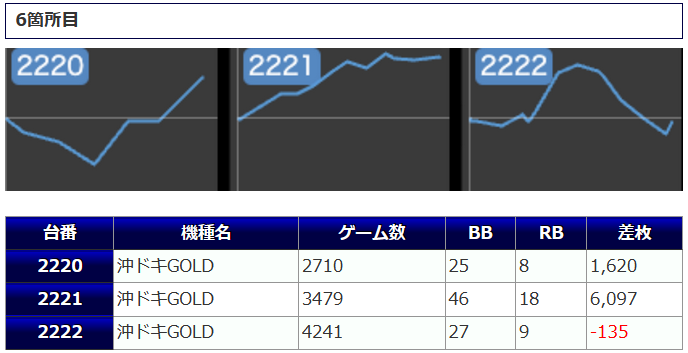 最後に「沖ドキGOLD」こちらは+3,859枚、+3,185枚、+1,812枚と、3台並んで余裕のプラス差枚を達成。