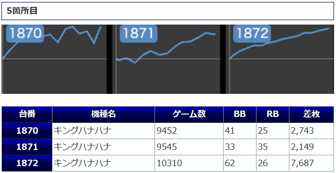 まず、5箇所15台と仕掛けの中心になっていた「キングハナハナ」では、⑤箇所目が+7,687枚、+2,743枚、+2,149枚と3台並んで文句無しの結果を披露。