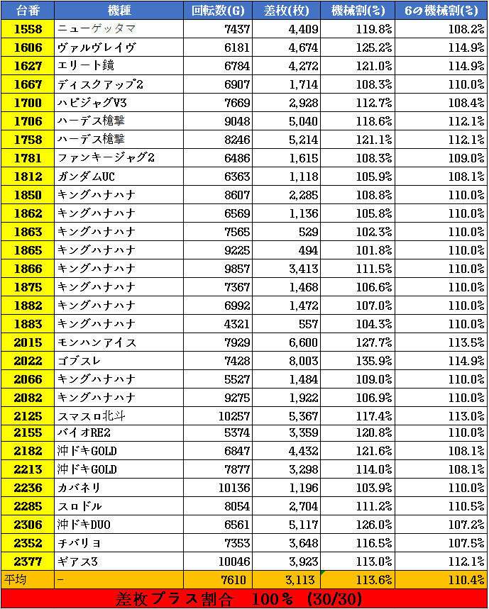 差枚プラスの割合 100%(30/30台)