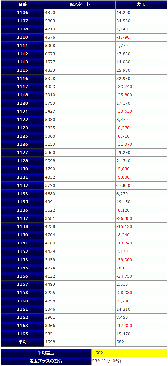 | 台あたりの平均差玉 | -1,089玉 |