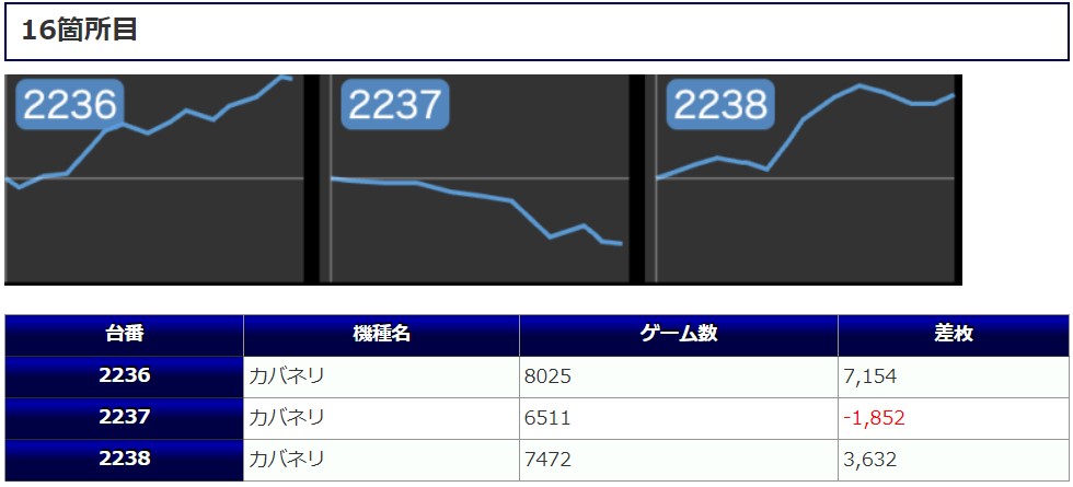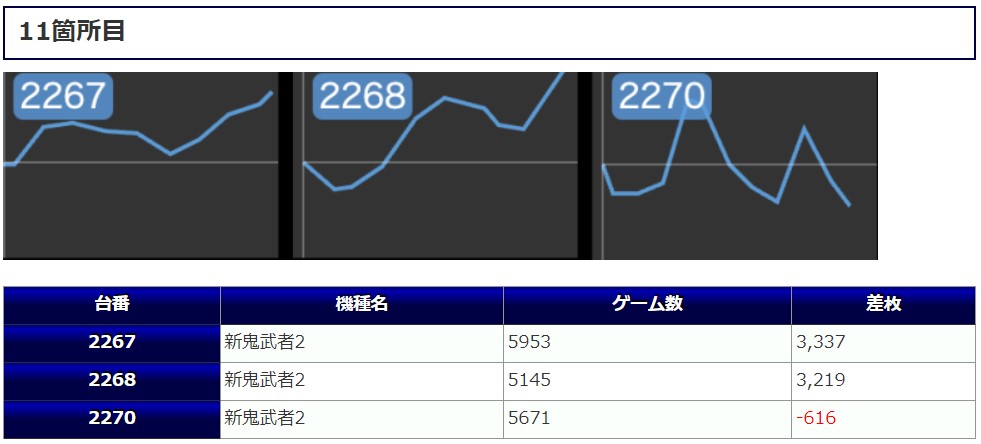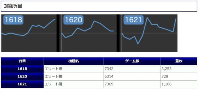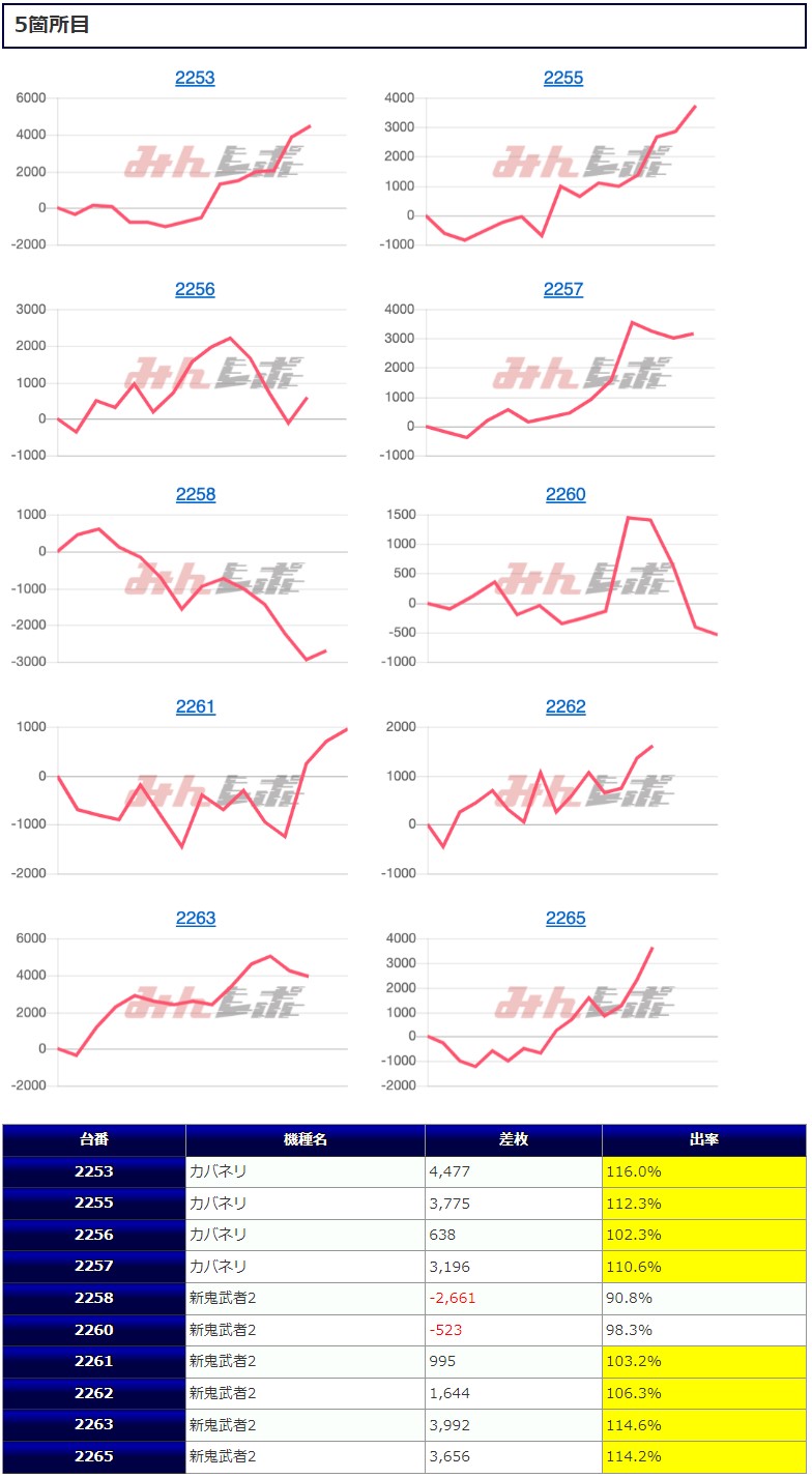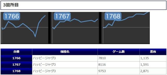 9台中6台がプラス差枚での決着となっており、3,000枚オーバーの差枚も見られました。