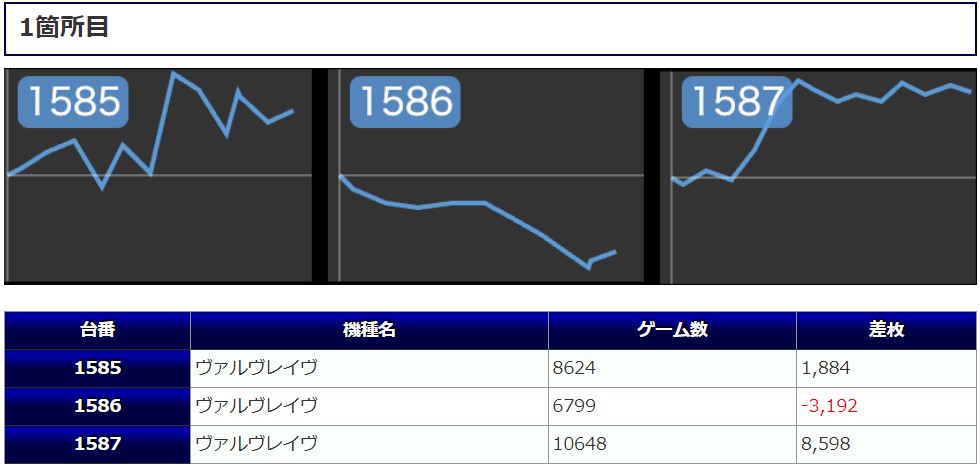 全体の出玉を見ていくと、「ヴァルブレイヴ」の +8,598枚を筆頭に、+7,000枚オーバー2台、+5,000枚オーバー4台、+4,000枚オーバー3台、+3,000枚オーバー6台、+2,000枚オーバー3台と、あちこちからかなりの出玉が溢れており、かなりの大判振舞だったことが判ります。