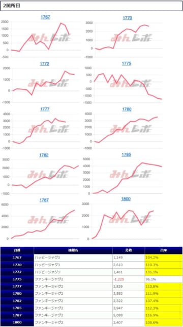 ジャグラーから唯一選出された「ファンキー」は、3台ともにプラス差枚での決着となりました。