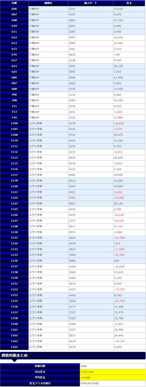 プラス差玉の割合は半数を超えていますが、大きいマイナス台が複数あったため、トータルではマイナスとなってしまいましたが、裏を返せばここまでハマるほど粘れる盤面であったと言えると思います。