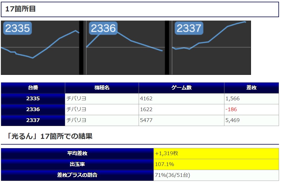 「エリート鏡」「ハッピー」「ハナハナ鳳凰天翔」「番長ゼロ」「沖ドキGOLD×2箇所」の6箇所が3台すべてプラス差枚という安定した結果を残しましたし、⑤⑥の恩恵があったと言えると思います。