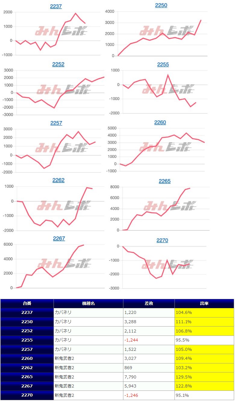 全体の結果としては【平均差枚 +1,989枚、出玉率 109.8%、差玉プラスの割合 82%(32/39台)】と優秀な結果となっていました。