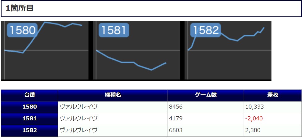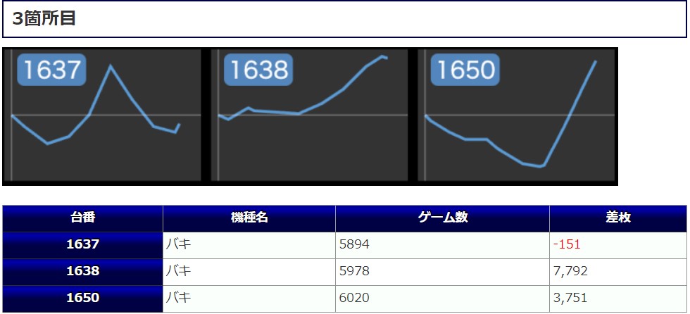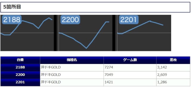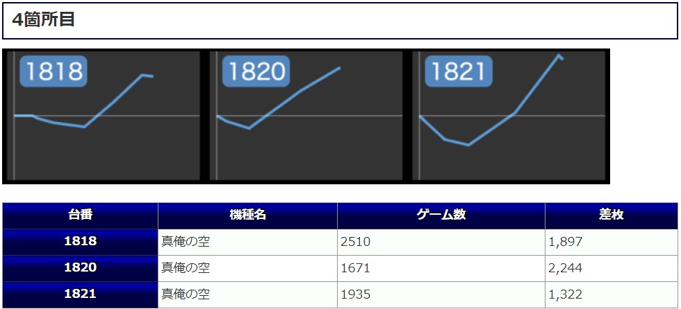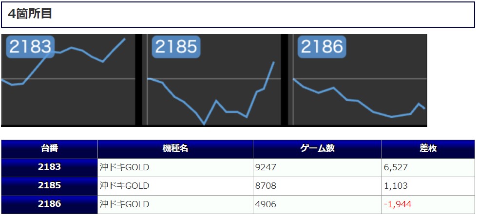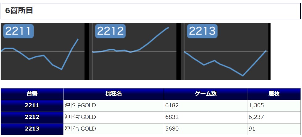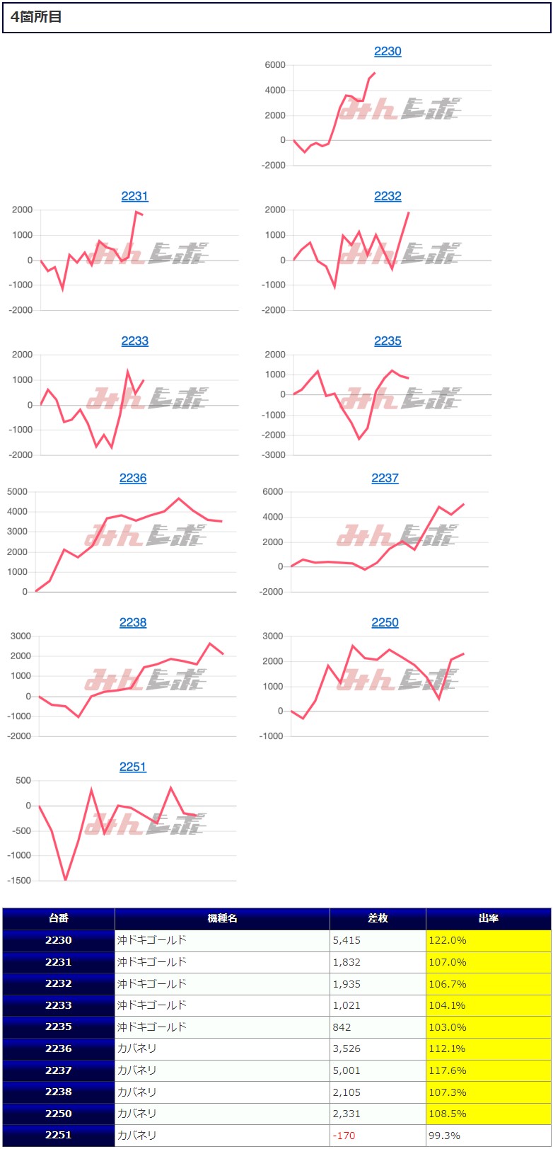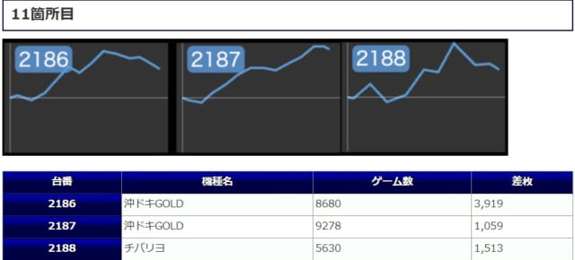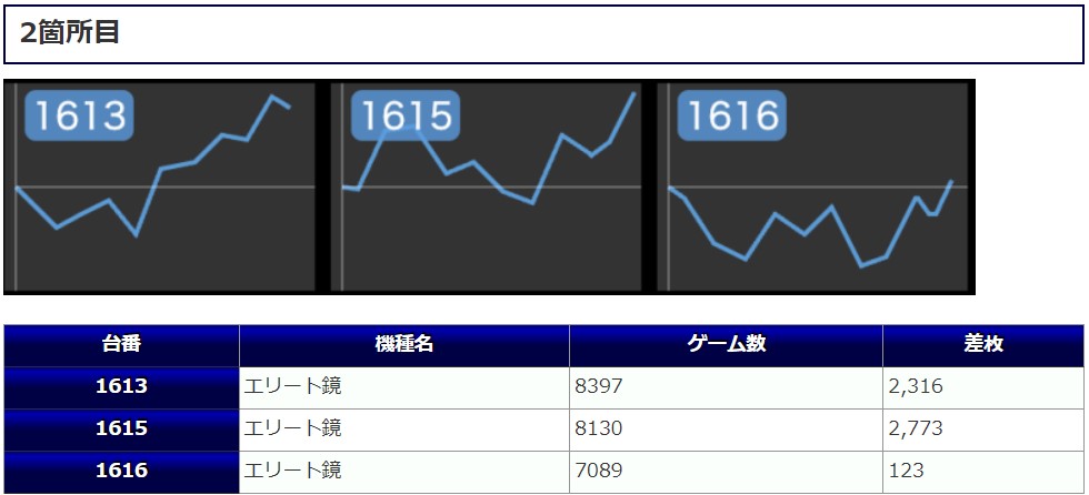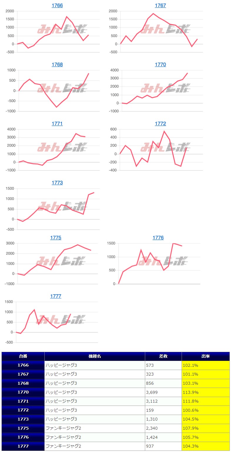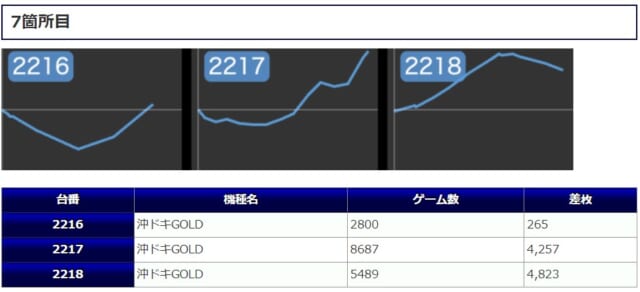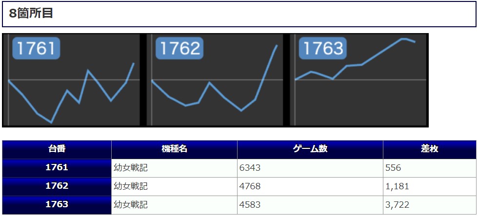 他にも +8,000枚オーバー1台、+5,000枚オーバー3台、+4,000枚オーバー6台、+3,000枚オーバー5台、+2,000枚オーバー9台と、あちこちで大きな差枚が見られました。