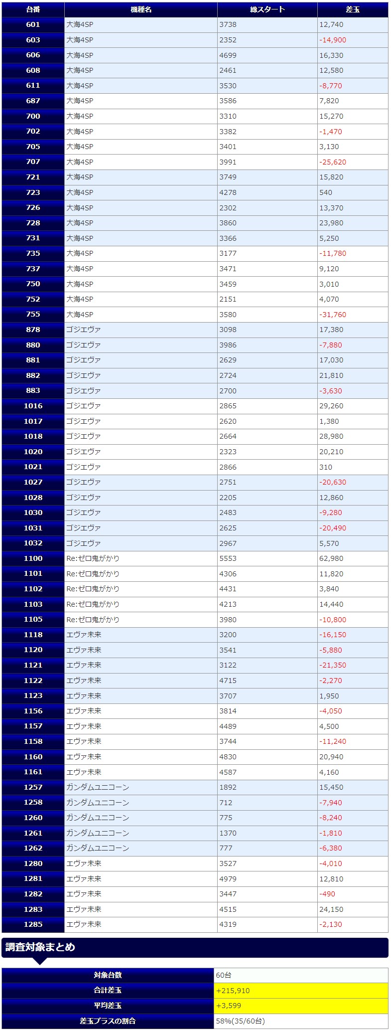 万発オーバーも散見していますし、トータルでもプラス差玉で着地していており、半数以上の台が勝利を収めました。