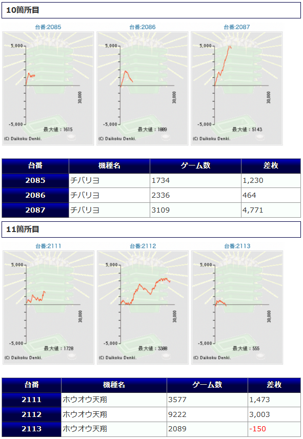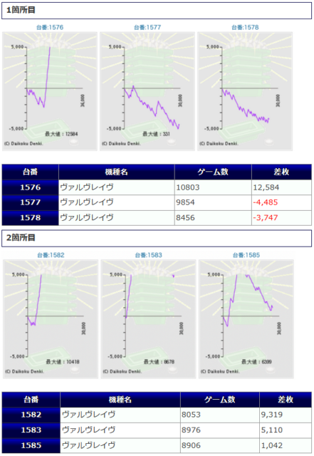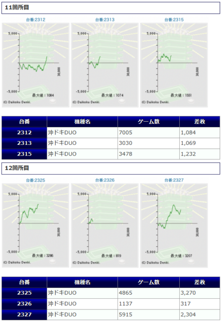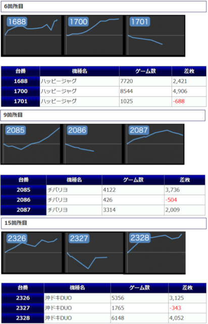 一方の沖スロコーナー「チバリヨ」「沖ドキDUO」は、殆どがプラス差枚での着地に成功し、マイナスは僅か1台と、状況の良さが感じられる結果に仕上がっています。