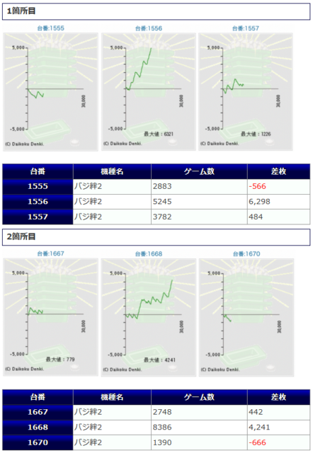 まず、2箇所6台の仕掛けとなっていた「絆2」ですが、1556番台から+6,298枚、1668番台から+4,241枚と大きな出玉が炸裂。
