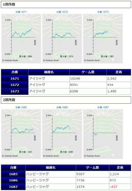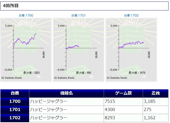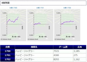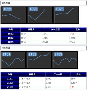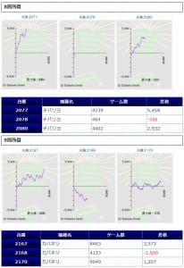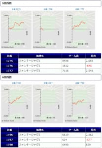 先述した出玉を多く獲得できた2台はしっかり粘られていますので、手応えを感じられていた事が見て取れますし、内容の良さが見て取れるような右肩上がりのスランプグラフになっていますね。