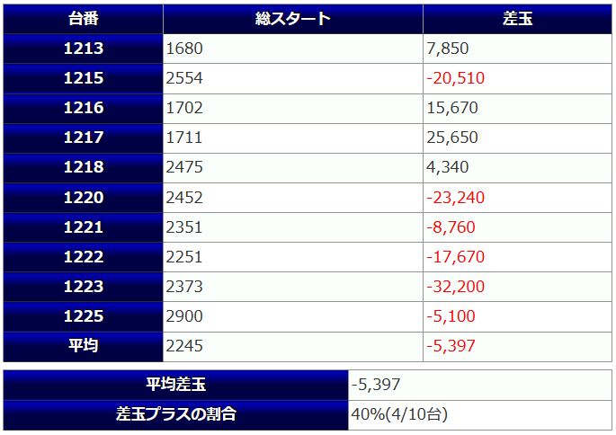 ・トータルの総差玉数はユーザー側マイナスとなってしまいましたが、打ち込み、結果共に申し分がなく、健闘を見せた台が複数存在していましたので、今回は☆2の評価にさせていただきたいと思います。