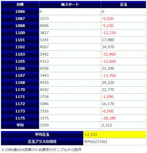 全15台の総差玉数は+34,450発、1台平均+2,153発でユーザー側プラスという結果になりました。